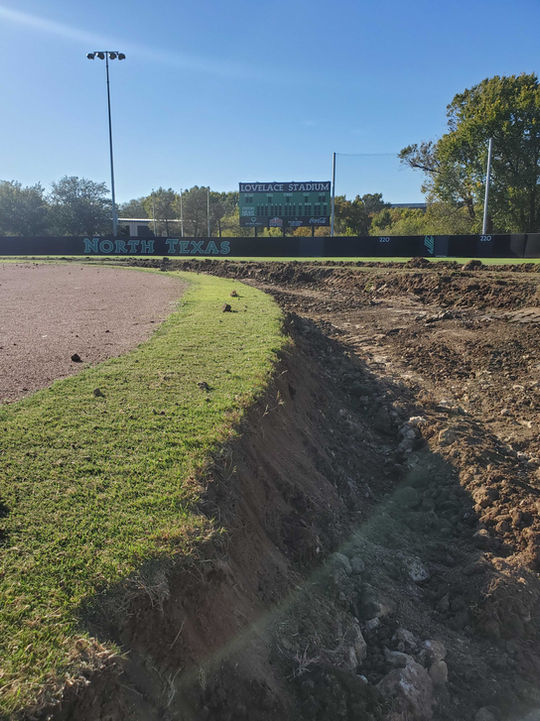 The University of North Texas contracted with Sports Field Solutions to convert their softball game field, Lovelace Stadium, from a native soil rootzone to a sand-based field with a top-tier french drainage system. With this field conversion, UNT also elected to install a new, head-to-head coverage irrigation system and install new infield clay.